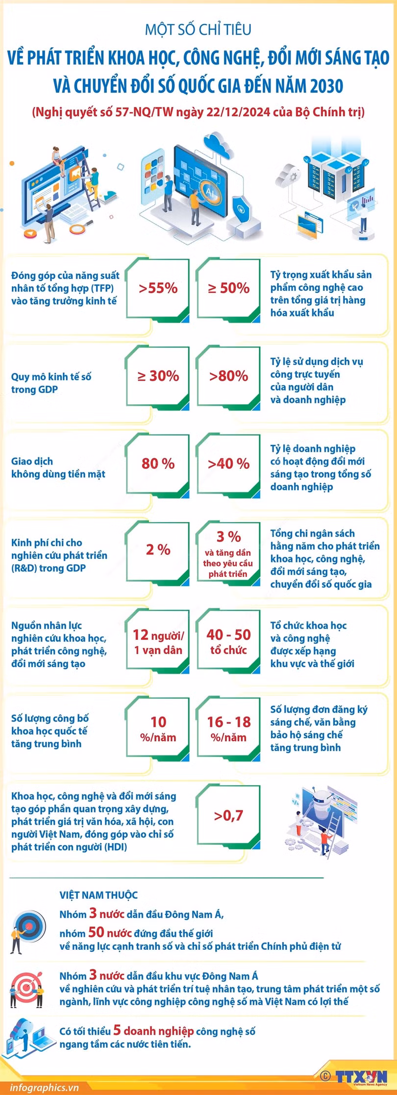 Tổng Bí thư Tô Lâm ký ban hành Nghị quyết số 57-NQ/TƯ ngày 22/12/2024 của Bộ Chính trị về đột phá KHCN, đổi mới sáng tạo và chuyển đổi số quốc gia (Nghị quyết 57). Nghị quyết xác định rõ: Bộ 3 KHCN, đổi mới sáng tạo và chuyển đổi số là những yếu tố quyết định sự phát triển của một quốc gia. Trong đó, đổi mới sáng tạo đóng vai trò động lực, chuyển hoá tri thức, công cụ thành ý tưởng, giải pháp. KHCN là nền tảng, tạo ra tri thức và công cụ. Chuyển đổi số hiện thực hóa các ý tưởng, giải pháp thành sản phẩm, dịch vụ, tạo ra giá trị kinh tế.