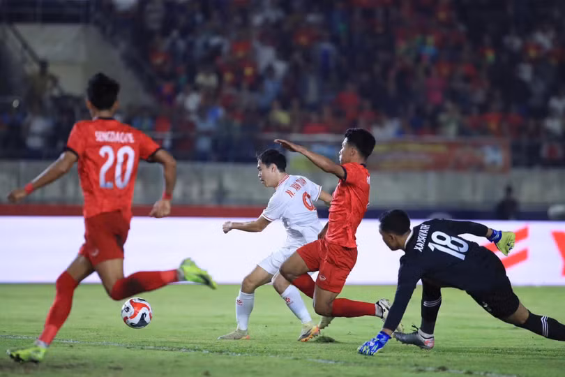 Phút 55, Duy Mạnh treo bóng vừa tầm để Vĩ Hào chạy chỗ, dứt điểm bằng đầu đưa bóng hướng về góc xa. Dù vậy, thủ môn Souvanhansok vẫn kịp bay người cứu thua cho đội chủ nhà.
