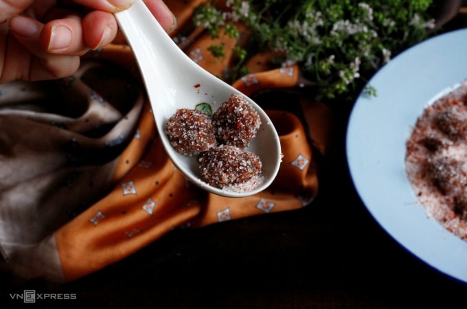 Trộn bột và tạo hình: Sau khoảng 1 tiếng xào sên, khi me đường quyện đều thành khối đồng nhất, lấy một ít lên thấy không dính tay là đạt. Tắt bếp, chia bột nếp đã rang chín làm 2 lần, rây từ từ bột nếp vào, trộn đều đến khi hỗn hợp dẻo mịn, khô ráo và có thể vo viên. Lấy từng phần nhỏ me, vo viên vừa ăn rồi lăn kẹo me qua hỗn hợp đường muối ớt áo phủ đều bên ngoài. Làm lần lượt cho đến hết.
