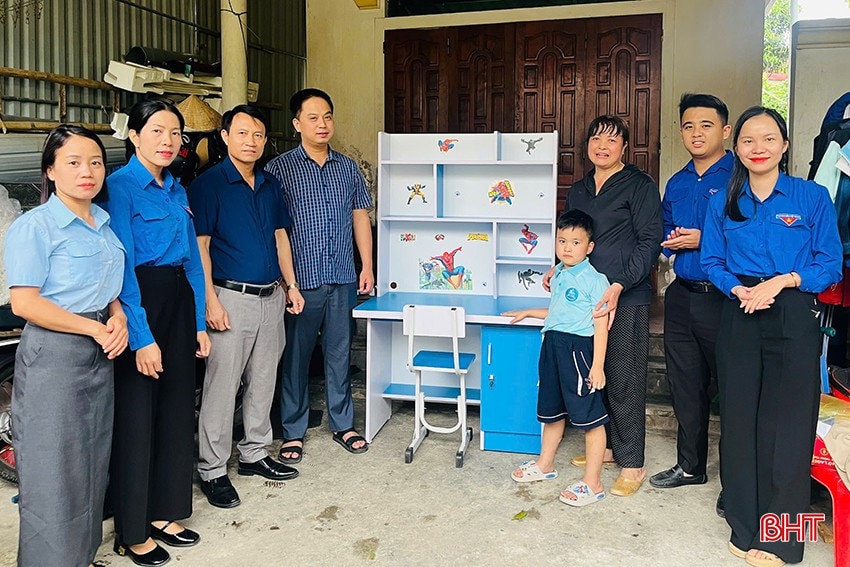 Thị đoàn - Hội đồng Đội thị xã Hồng Lĩnh trao tặng góc học tập cho em Đặng Quang Ánh - Lớp 1A1 (Trường Tiểu học Đức Thuận) là học sinh có hoàn cảnh khó khăn.