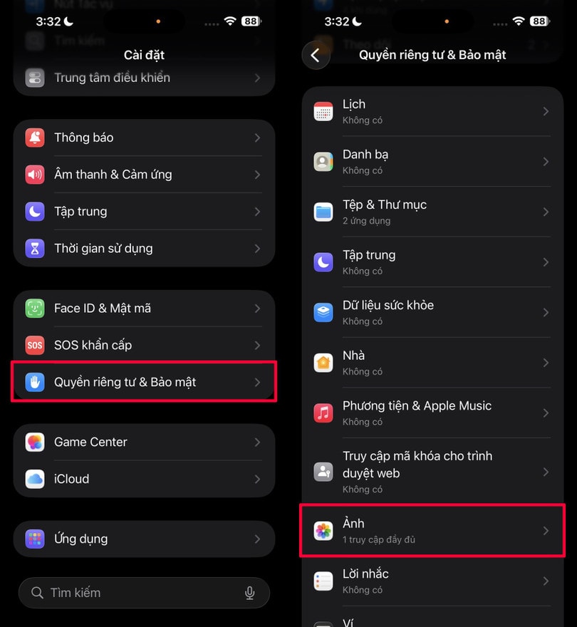Một số máy sau khi cập nhật có thể bị thay đổi quyền truy cập vào thư viện ảnh, khiến iPhone không thể lưu lại ảnh chụp màn hình. Bạn nên mở Cài đặt và vào mục Quyền riêng tư để xem ứng dụng Ảnh có đang được cấp quyền đầy đủ hay không. Nếu quyền bị đặt về mức hạn chế, việc lưu ảnh sẽ không thể thực hiện. Chỉ cần bật lại quyền truy cập là hệ thống sẽ cho phép lưu ảnh bình thường và lỗi chụp màn hình cũng được khắc phục.