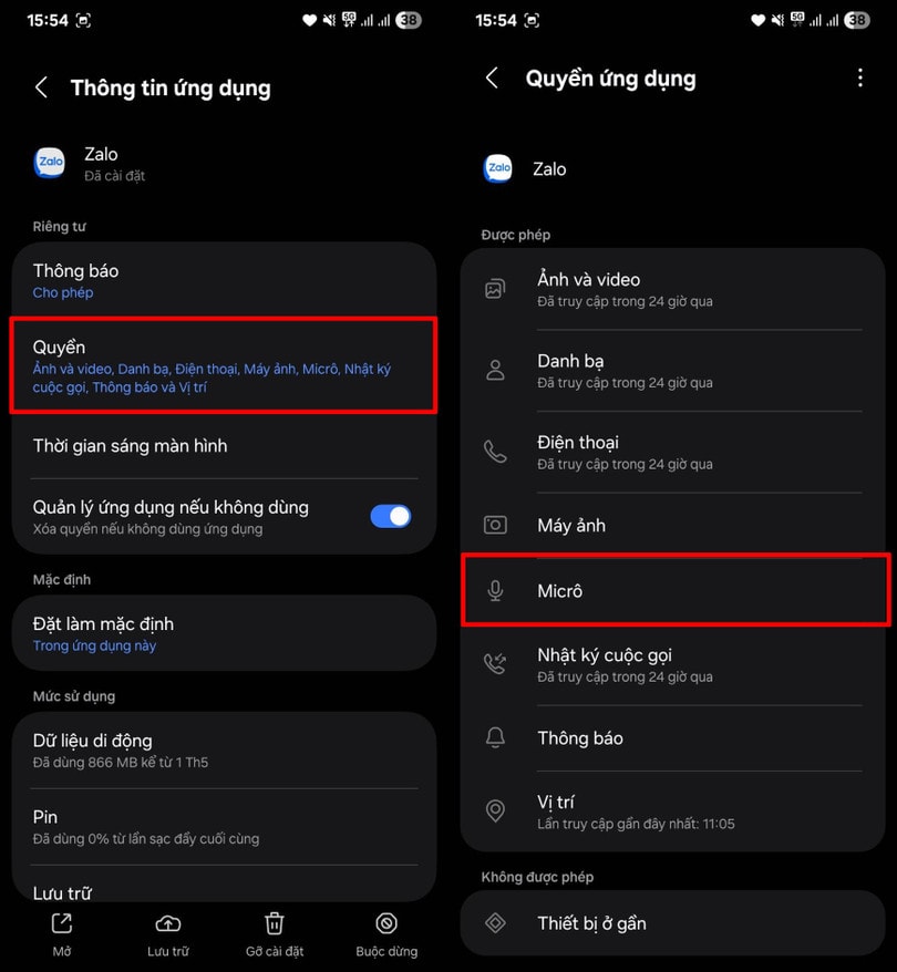 Bước 2: Tại mục Quyền, kiểm tra xem quyền truy cập Micro của ứng dụng đã được cho phép hay chưa. Nếu chưa, hãy bật cho phép ngay tại đây để Zalo có thể sử dụng micro khi gọi.