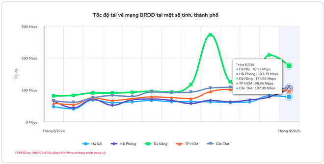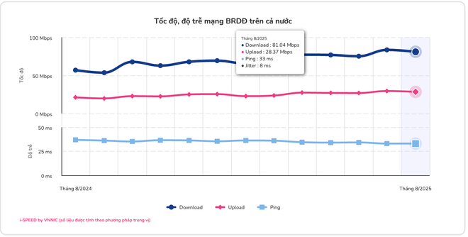 Theo số liệu mới nhất từ nền tảng đo tốc độ i-Speed (thuộc Trung tâm Internet Việt Nam - VNNIC, Bộ Khoa học và Công nghệ), trong tháng 8/2025, tốc độ tải xuống trung bình của mạng băng rộng cố định trên cả nước đạt 271,2 Mbps và tốc độ tải lên đạt 200,99 Mbps. Đây là tháng thứ sáu liên tiếp chất lượng mạng được cải thiện kể từ nhịp tăng hồi tháng 3/2025.
