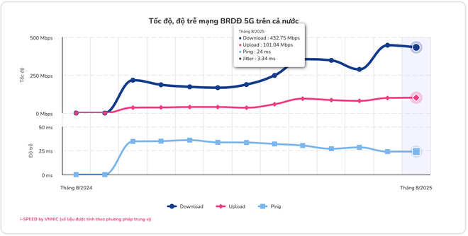 Trong tháng 8/2025, chất lượng mạng băng rộng di động 5G trên toàn quốc ghi nhận mức ổn định, với tốc độ tải xuống đạt 432,75 Mbps và tốc độ tải lên trung bình đạt 101,04 Mbps.