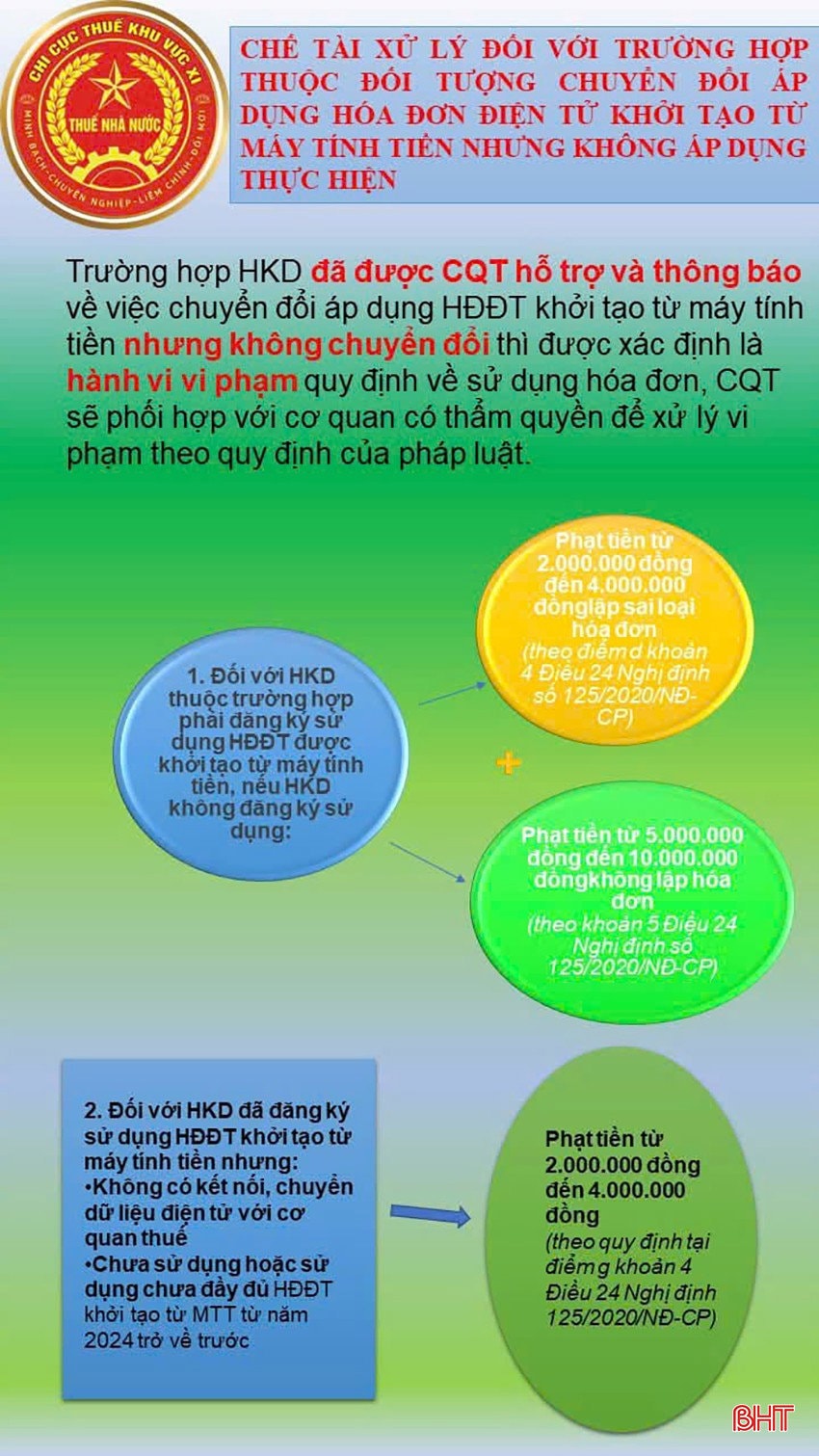 Ông Lê Hồng Liêm - Đội trưởng Đội Thuế liên huyện TP Hà Tĩnh – Cẩm Xuyên cho biết: "Xác định công tác quản lý hộ kinh doanh có ý nghĩa quan trọng trong nhiệm vụ thu ngân sách Nhà nước, đội tích cực vận động, khuyến khích hộ, cá nhân kinh doanh chuyển sang nộp thuế theo phương pháp kê khai để tăng tính minh bạch, chống thất thu thuế. Để sử dụng hóa đơn điện tử khởi tạo từ máy tính tiền, hộ kinh doanh chỉ cần đáp ứng điều kiện có kết nối internet và có máy vi tính hoặc điện thoại thông minh, Ipad. Đồng thời, hộ kinh doanh thực hiện đăng ký sử dụng hóa đơn điện tử khởi tạo từ máy tính tiền với cơ quan thuế và được cơ quan thuế chấp nhận".