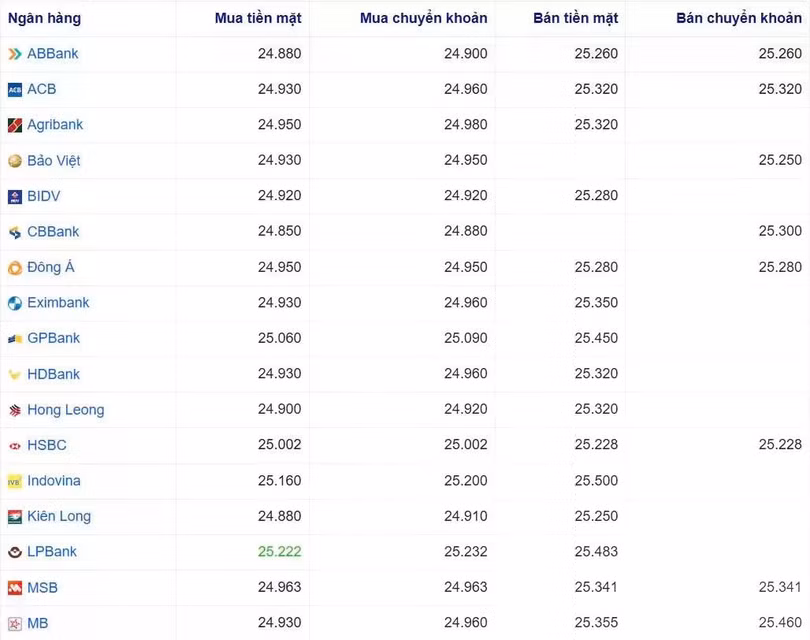 Ngân hàng LPBank, OceanBank đang mua tiền mặt USD với giá cao nhất là: 1 USD = 25.222 VND