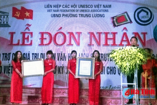 (Baohatinh.vn) - UBND thị xã Hồng Lĩnh và UBND phường Trung Lương vừa long trọng tổ chức lễ đón nhận Bằng bảo trợ các giá trị di sản văn hóa truyền thống của UNESCO Việt Nam và thế giới cho quần thể Di tích lịch sử văn hóa Tiên Sơn (phường Trung Lương, TX Hồng Lĩnh).