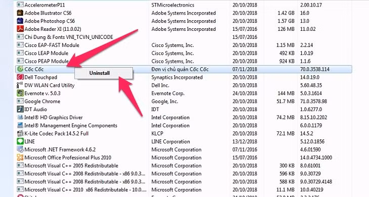 Bước 3: Nhấp chuột trái chọn chương trình phần mềm bạn muốn loại bỏ, rồi nhấp chuột phải bấm Uninstall là xong.