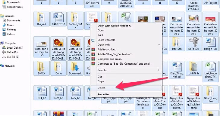Bước 2: Click chuột chọn tất cả file, nhấp chuột phải Delete là xong