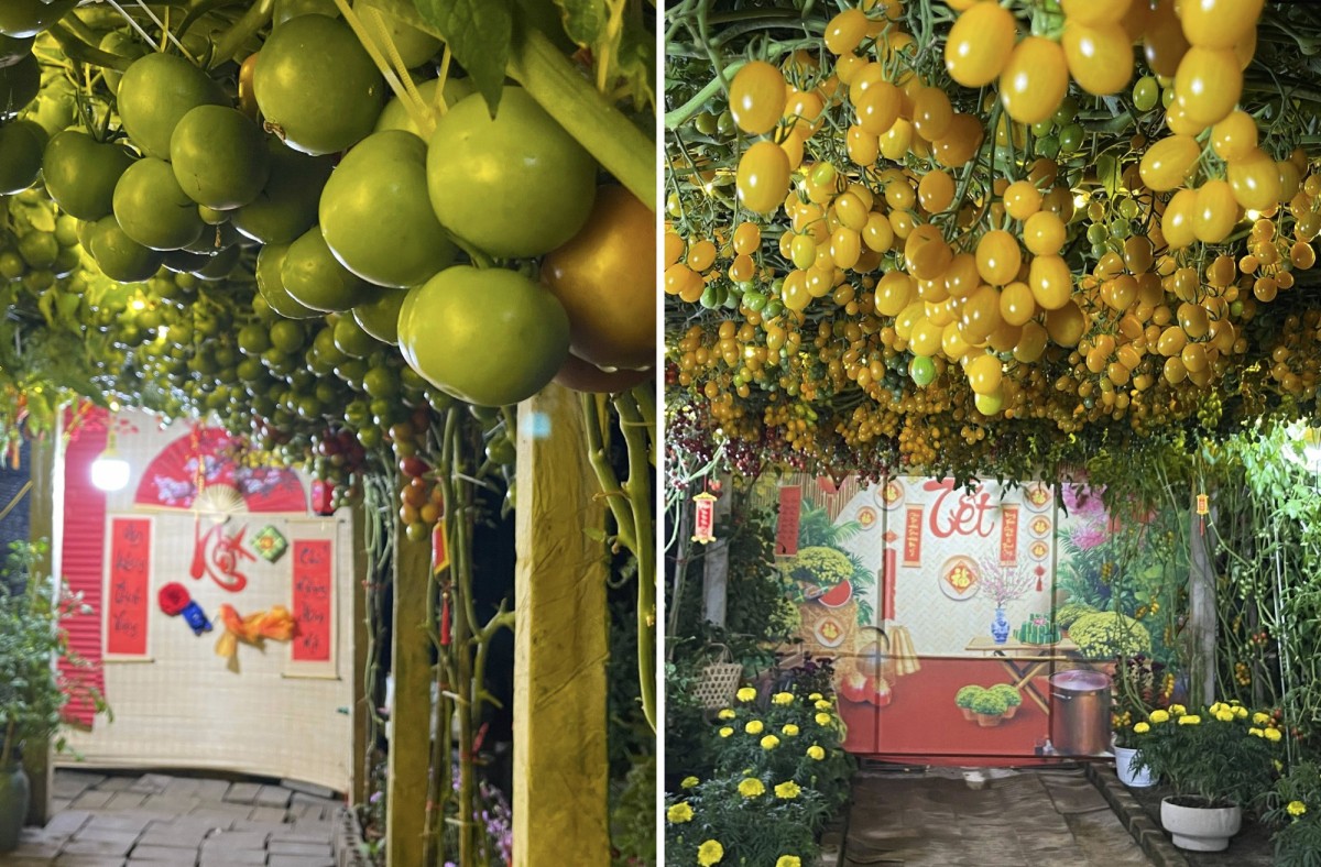 Hai giàn cà chua trĩu quả trên diện tích gần 40 m2 của chị Thanh Xuân, 42 tuổi, bất ngờ đón hàng nghìn lượt khách về chiêm ngưỡng dịp Tết Bính Ngọ.