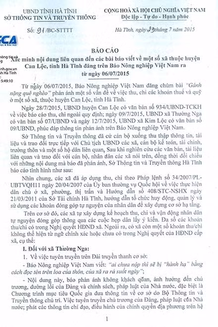 | Báo cáo số 91 ngày 29.7.2015 của Sở TTTT Hà Tĩnh về sự việc. Ảnh: Q.Đ |