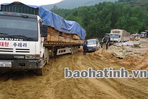 Khoảng 14h30' chiều nay (25/11), chiếc xe đầu kéo mang BKS Lào 2829 kéo rơ-moóc BKS 2929 chở đầy gỗ bị sụp vũng bùn trên chiếc cầu tạm ở địa phận xã Sơn Trà (nối xã Sơn Trà với xã Sơn Long (Hương Sơn), khiến quốc lộ 8A bị ách tắc.