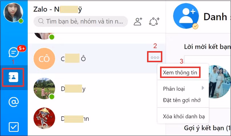 Cách 1: Truy cập vào Danh bạ > Nhấn chuột phải hoặc chọn biểu tượng ba chấm vào bạn bè muốn xem số điện thoại> chọn Xem thông tin để xem được số điện thoại.