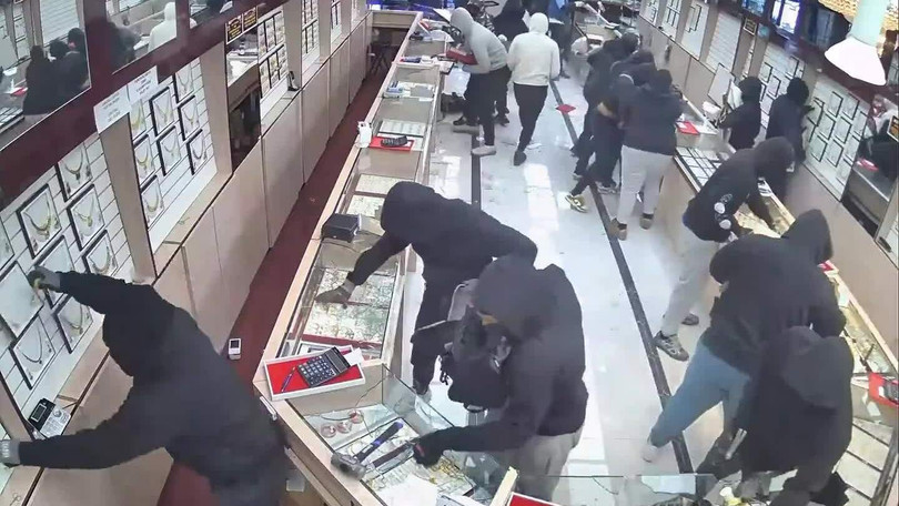 Video cho thấy một đoàn ôtô lao vào bãi đỗ trước tiệm vàng, sau đó gần 20 người đeo mặt nạ và trùm mũ tràn vào bên trong. Các nghi phạm mang theo cuốc chim và búa để phá tủ trưng bày trang sức.
